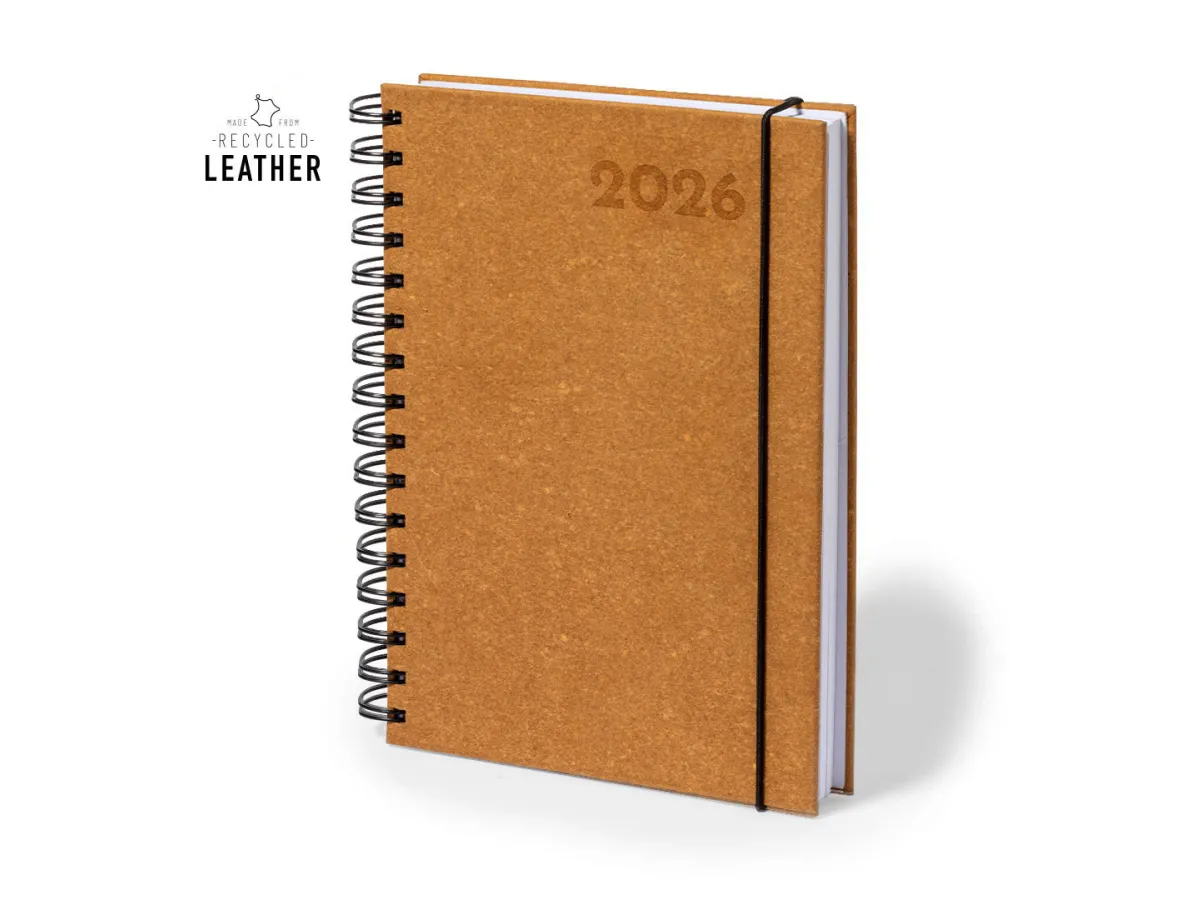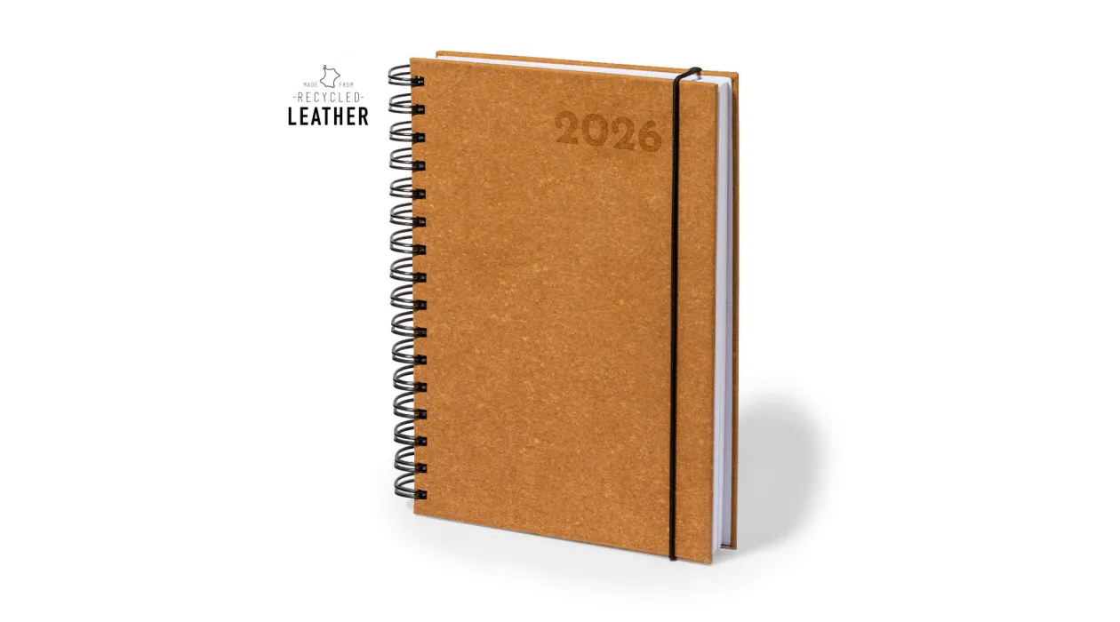 Agenda de tamaño A5 fabricada en elegante y sostenible cuero reciclado. Con cubiertas rígidas y elástico de cierre. Con distintivo cuero reciclado.